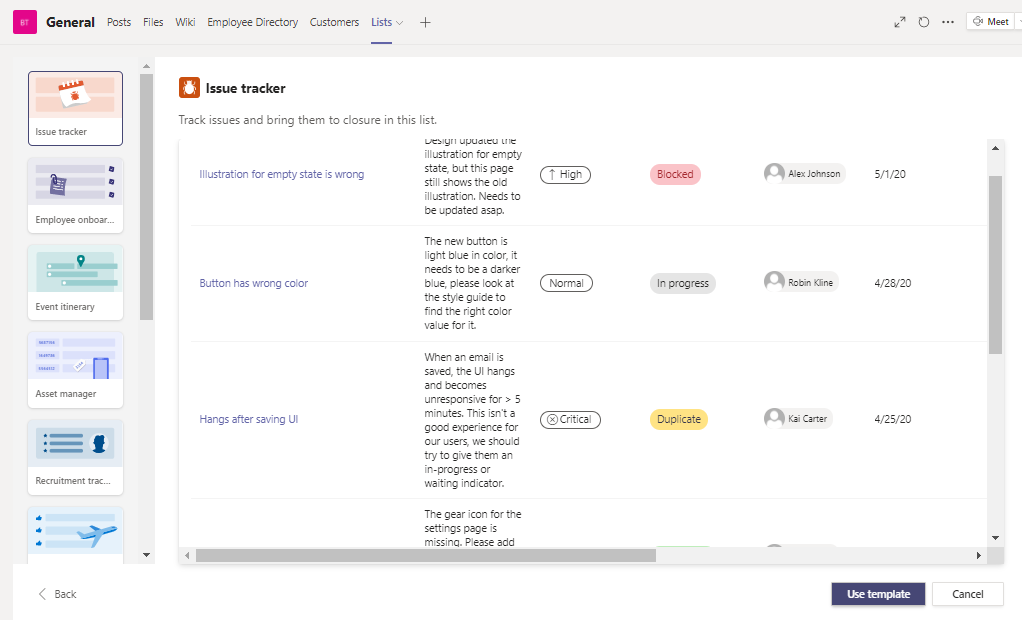 d. Templates: Select a template, such as an ‘Issue tracker,’ to see what columns the template has. You can then scroll through sample data to see what to include. Select the templates that fit your specific needs. Click the ‘Use Template’ button.