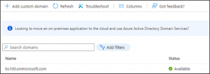 6. In the Custom domain name box, enter the full new “. onmicrosoft.com” domain, and then select Add domain. ( It must be a “onmicrosoft.com” domain when adding the domain. For example, if you wish to rename your tenant to fabrikam.sharepoint.com, put fabrikam.onmicrosoft.com as the domain. You do not need to buy the “onmicrosoft.com” domain and no public DNS registration is required to use it.)