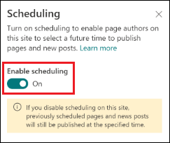 Note: you need to be a site owner to enable/disable scheduling on the site. When you disable scheduling, page authors no longer have the option of scheduling their pages or news. However, any pages or news posts that were scheduled prior to disabling will still get published at the time specified unless the scheduling for the individual pages is removed.