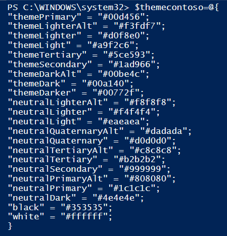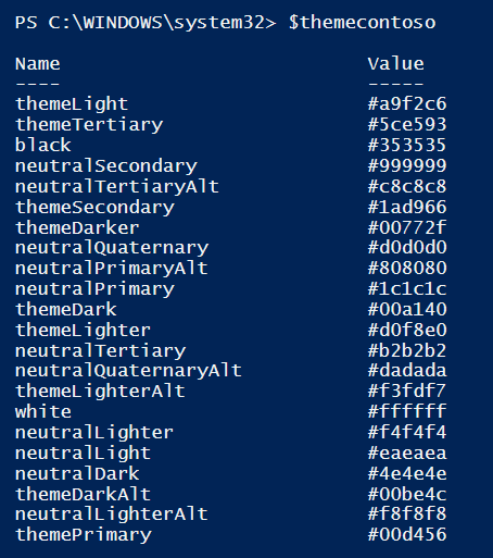 12. Now again write “$themecontoso” at the end of the script and press enter and you will find that the values are assigned to variables.